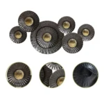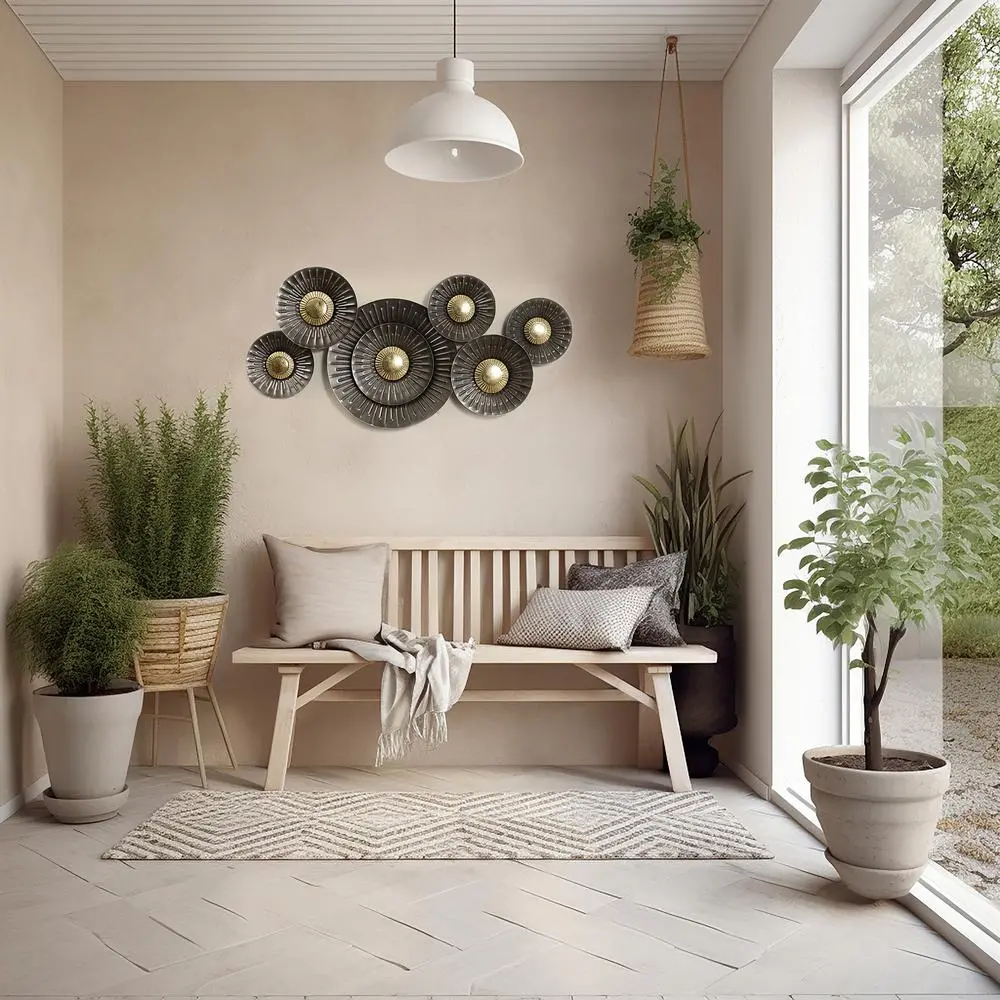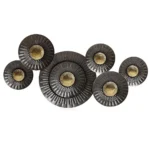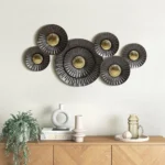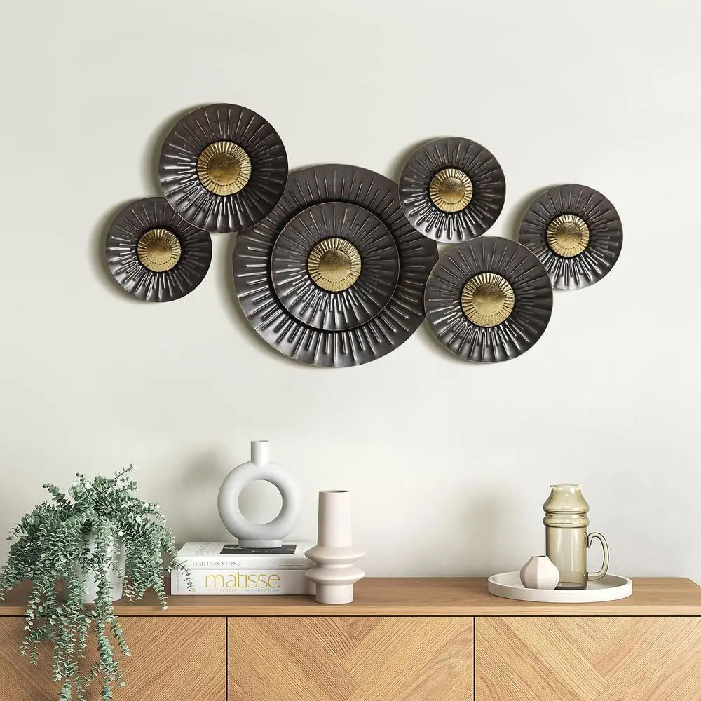 This exquisite metal wall decor exhibits a unique flower-like shape, consisting of six circles of different sizes connected to a sturdy iron frame. The decor is adorned with a sophisticated blend of brown and gold hues, exuding an opulent charm that seamlessly complements any living space. It can be placed in any room, serving as a striking centerpiece that reflects light in a mesmerizing manner, creating an ambiance of sheer elegance.