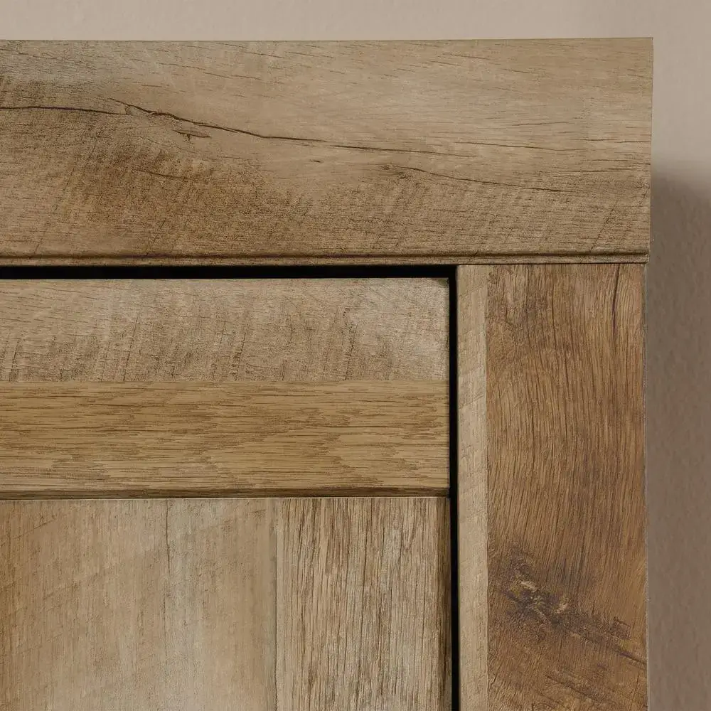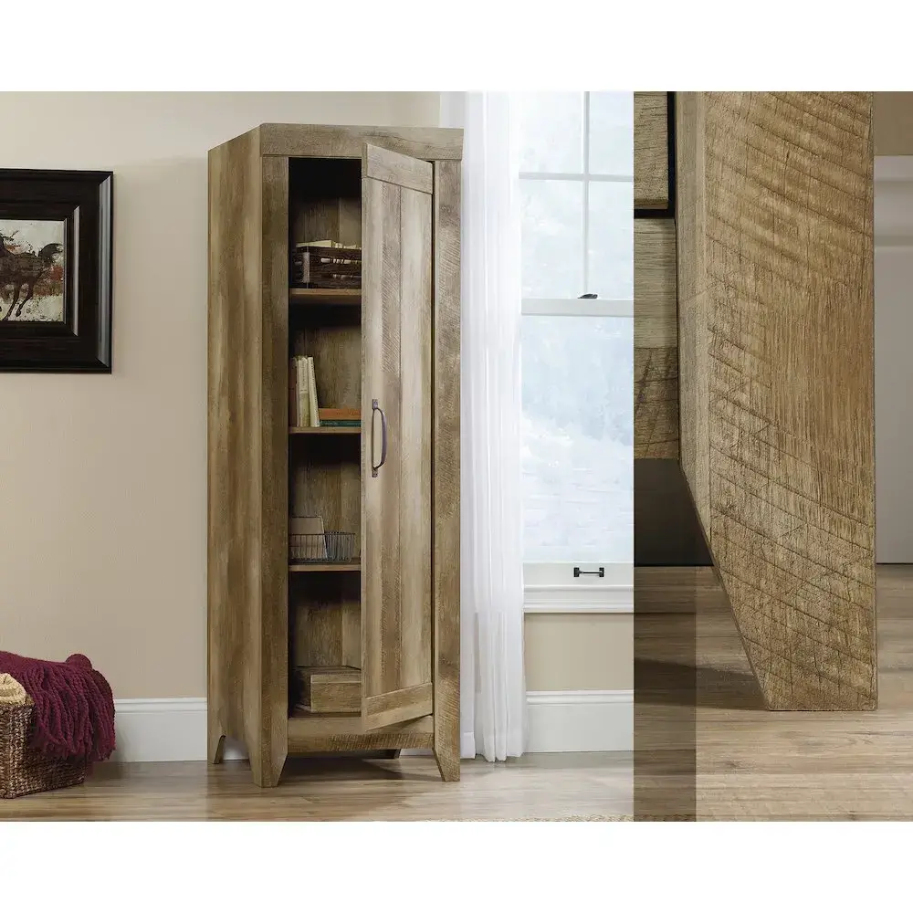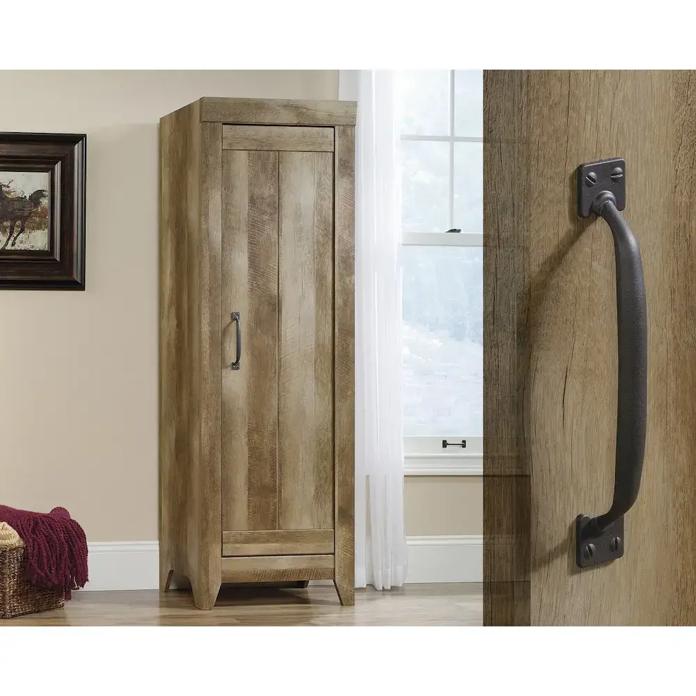 Storage and style where you need itwithout taking up precious space in your home. This narrow storage cabinet from the Adept Storage collection offers plenty of room for all your stuff and is just the right size to fit almost anywhere. Three adjustable shelves behind its stunning storage door allows you to customize your storage cabinet to your liking and needs. This tall cabinet is the ideal place to stack and stow away towels or blankets, your favorite board games, your latest books, essential organizing bins, and more. For additional customization options, the door on this farmhouse cabinet can be configured to open from either the left or the right sideso it fits perfectly in your home, no matter where you need the extra storage. Finished in a textured Craftsman Oak, this cabinet will hide your clutter and add some carpenter-inspired style wherever it stands.