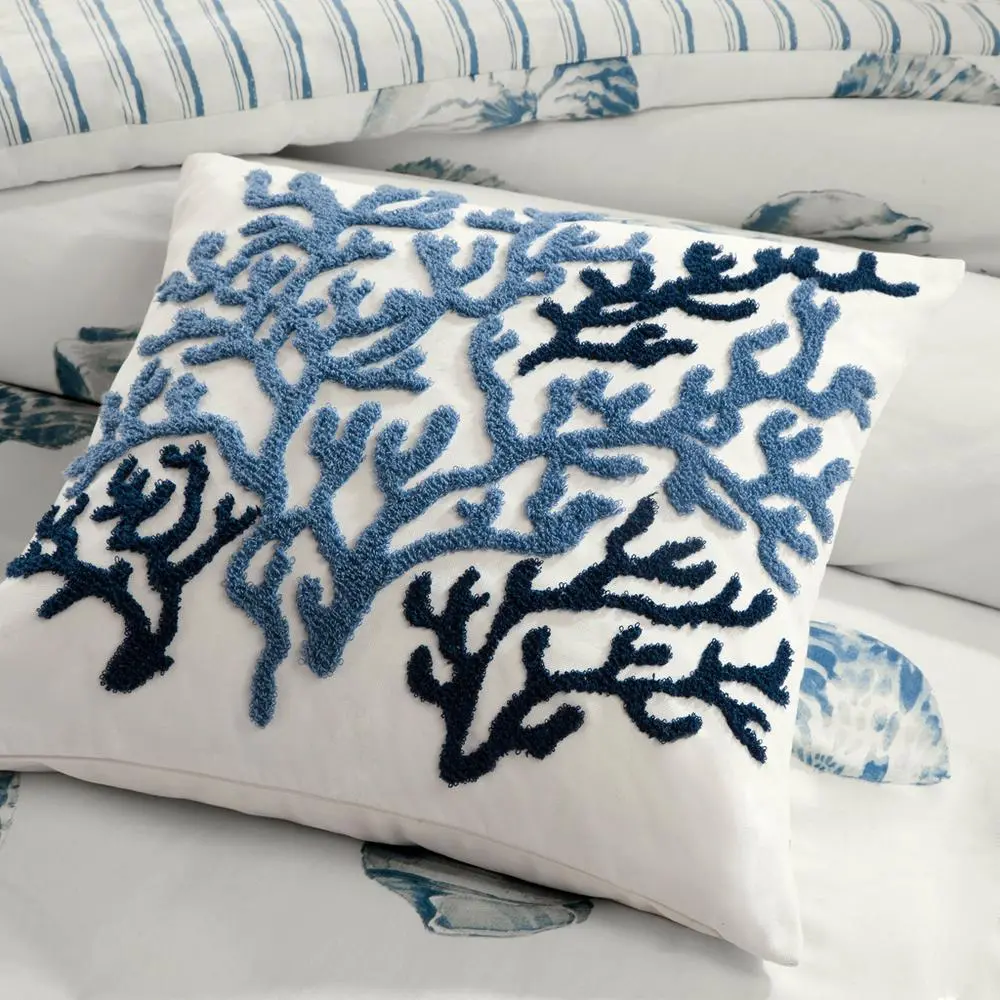Bring a sense of the sea side into your home with this beautiful, casual decorative pillow from the Beach House bedding collection from Harbor House. This square decorative pillow features an embroidered coral design in shades of blue onto a white, cotton brushed twill. Use this pillow to complete the look in your Beach House bedding set. This item is also OEKO-TEX certified, meaning it does not contain any harmful substances or chemicals, ensuring quality comfort and wellness. Spot clean only.