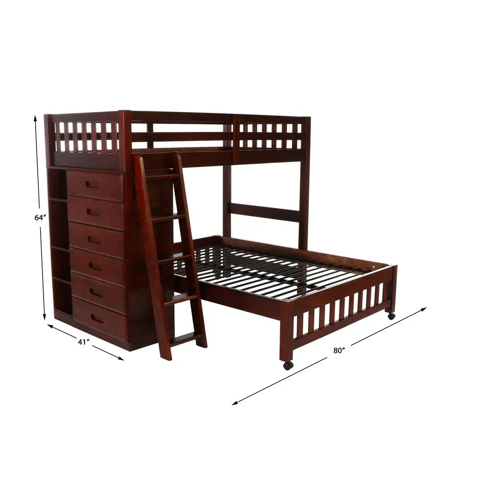 This ready-to-assemble unit in a rich merlot finish features a twin over full bunk bed with a six-drawer storage unit and four built in shelves for storage. A full length ladder provides easy access to the twin top bunk. Quality and solid wood construction makes this bed a great buy.
