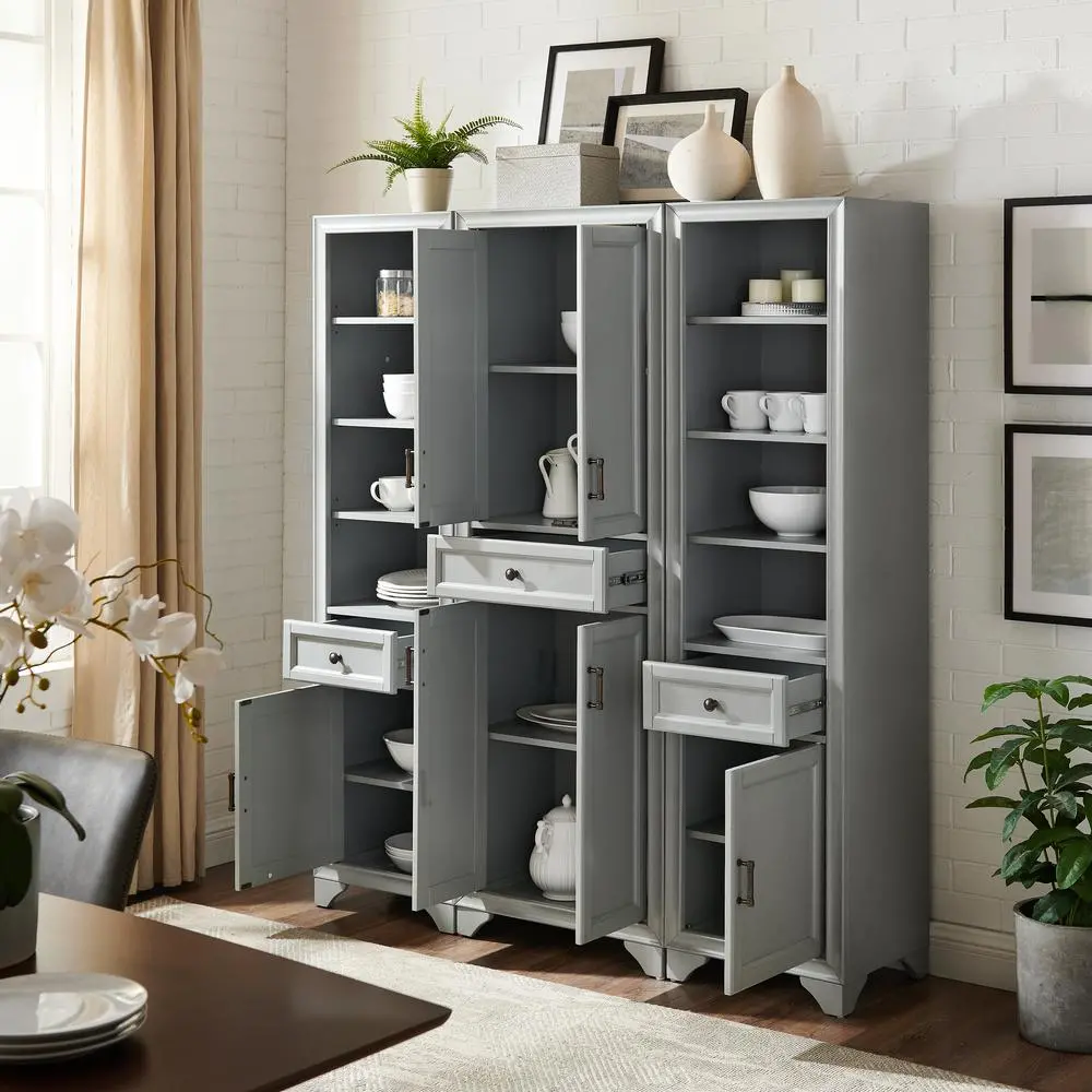 Charming and functional, the Tara 3pc Pantry set is no longer solely a kitchen item and will add traditional elegance to any room of your home. While the adjustable shelves in the upper and lower cabinets of the pantry are ideal for kitchenware or cleaning supplies, they also make a great place to store extra blankets, books, and board games. Add in the two tall cabinets with open adjustable shelving and you have display space as well. All of the cabinets feature beautiful metal hardware, as do the full-extension storage drawers in each unit. The storage drawers will be great catch-alls for odds and ends, making the Tara 3pc Pantry Set a perfect go-to for home organization.